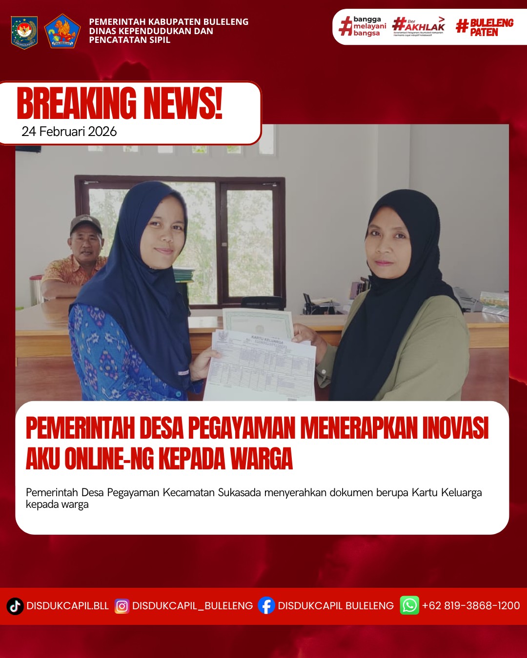Pemerintah Kabupaten Buleleng melalui Dinas Kependudukan dan Pecatatan Sipil (Disdukcapil) Kabupaten Buleleng memaksimalkan serta mempermudah pelayanan kependudukan masyarakat dengan beberapa inovasi, melalui aplikasi AKU Online-NG. Dimana dalam penerapan aplikasi Aku Online-NG tersebut masyarakat tidak perlu lagi datang ke Dinas Dukcapil untuk melakukan pelayanan langsung cukup dengan datang ke Desa nanti akan dibantu oleh operator Desa masing-masing. Di Desa Pegayaman Kecamatan Sukasada, telah diserahkan dokumen kependudukan berupa Kartu Keluarga kepada warga atas nama MADINATUL MUNAWAROH kepada warga yang beralamat di Banjar Dinas Kubu Desa Pegayaman yang diserahkan langsung oleh Kasi Pemerintahan Desa Pegayaman, Selasa (24/2).