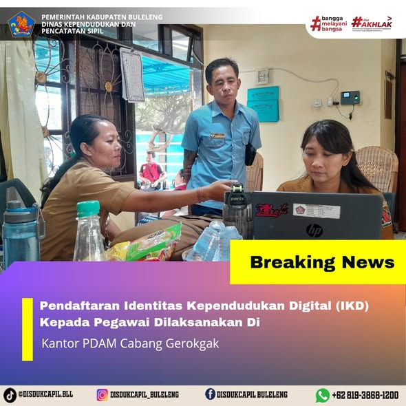 Menerapkan aturan pemerintah tersebut, Dinas Kependudukan dan Pencatatan Sipil Kabupaten Buleleng menyelenggarakan Pendaftaran Identitas Kependudukan Digital ke sekolah-sekolah, Dinas, Lembaga dan Perusahaan secara bergilir setiap harinya. Kali ini pelaksanaan pendaftaran Identitas Kependudukan Digital kepada pegawai yang dilaksanakan di Kantor PDAM Cabang Gerokgak, Senin (24/11).
