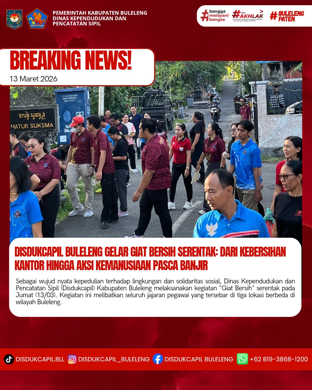 Sebagai wujud nyata kepedulian terhadap lingkungan dan solidaritas sosial, Dinas Kependudukan dan Pencatatan Sipil (Disdukcapil) Kabupaten Buleleng melaksanakan kegiatan "Giat Bersih" serentak pada Jumat (13/03). Kegiatan ini melibatkan seluruh jajaran pegawai yang tersebar di tiga lokasi berbeda di wilayah Buleleng.