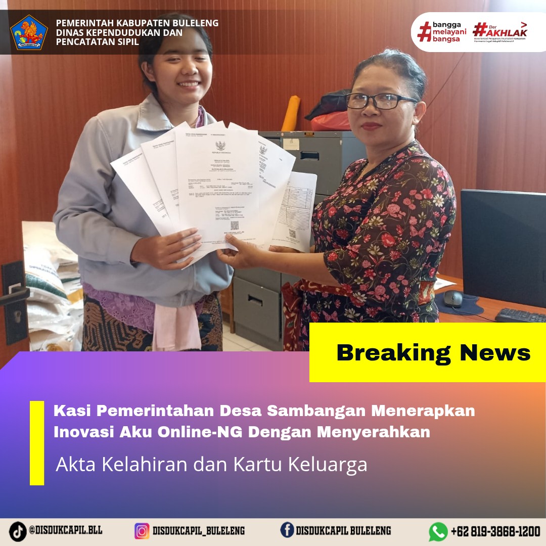 Pemerintah Kabupaten Buleleng melalui Dinas Kependudukan dan Pecatatan Sipil (Disdukcapil) Kabupaten Buleleng memaksimalkan serta mempermudah pelayanan kependudukan masyarakat dengan beberapa inovasi, melalui aplikasi AKU Online-NG. Dimana dalam penerapan aplikasi Aku Online-NG tersebut masyarakat tidak perlu lagi datang ke Dinas Dukcapil untuk melakukan pelayanan langsung cukup dengan datang ke Desa nanti akan dibantu oleh operator Desa masing-masing. Di Desa Sambangan Kecamatan Sukasada, telah diserahkan dokumen kependudukan berupa Akta Kelahiran atas nama I Made Dwi Suwastra, Gede Destra Aditya Bramasta, Made Danes Abdi Baskara dan juga penyerahan Akta Perkawinan dan Kartu Keluarga kepada warga bertempat di Kantor Perbekel Desa Sambangan, Kecamatan Sukasada, Kabupaten Buleleng, Kamis (13/11).
