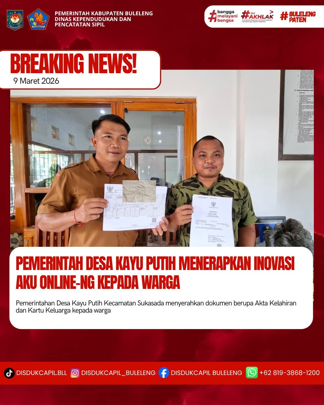 Pemerintah Kabupaten Buleleng melalui Dinas Kependudukan dan Pecatatan Sipil (Disdukcapil) Kabupaten Buleleng memaksimalkan serta mempermudah pelayanan kependudukan masyarakat dengan beberapa inovasi, melalui aplikasi AKU Online-NG. Dimana dalam penerapan aplikasi Aku Online-NG tersebut masyarakat tidak perlu lagi datang ke Dinas Dukcapil untuk melakukan pelayanan langsung cukup dengan datang ke Desa nanti akan dibantu oleh operator Desa masing-masing. Di Desa Kayu Putih Kecamatan Sukasada, telah diserahkan dokumen kependudukan berupa Akta Kelahiran atas nama Tude Aditama dan Kartu Keluarga atas nama Putu Redita warga Banjar Dinas Kayuputih, Desa Kayu Putih, Kecamatan Sukasada yang diserahkan secara langsung oleh Kasi Pemerintahan Desa Kayu Putih Kecamatan Sukasada, Senin (9/3).
