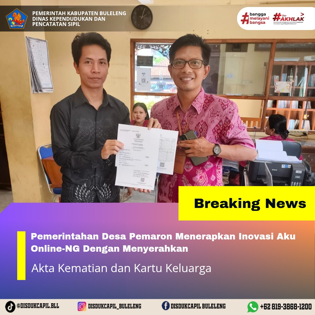 Pemerintah Kabupaten Buleleng melalui Dinas Kependudukan dan Pecatatan Sipil (Disdukcapil) Kabupaten Buleleng memaksimalkan serta mempermudah pelayanan kependudukan masyarakat dengan beberapa inovasi, melalui aplikasi AKU Online-NG. Dimana dalam penerapan aplikasi Aku Online-NG tersebut masyarakat tidak perlu lagi datang ke Dinas Dukcapil untuk melakukan pelayanan langsung cukup dengan datang ke Desa nanti akan dibantu oleh operator Desa masing-masing. Di Desa Pemaron Kecamatan Buleleng, telah diserahkan dokumen kependudukan berupa Akta Kematian atas nama I Nyoman Santhiyasa dan Kartu Keluarga atas nama Luh Manik yang diserahkan oleh Operator Desa Pemaron kepada warga bertempat di Kantor Perbekel Desa Pemaron, Kecamatan Buleleng, Kabupaten Buleleng, Selasa (23/12).