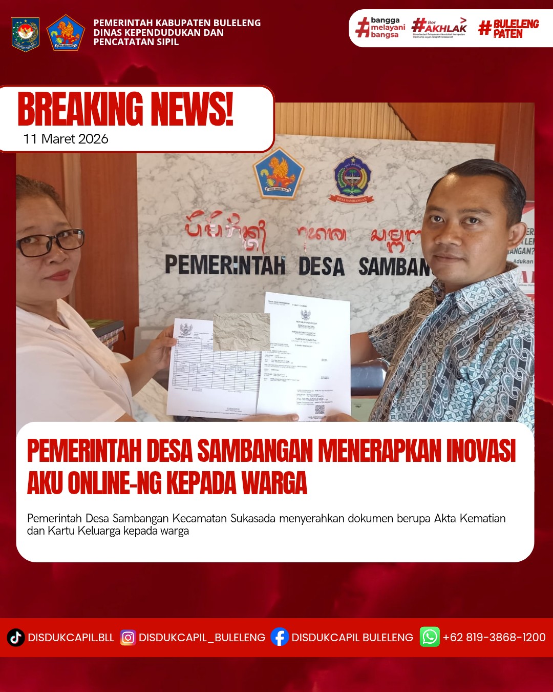 Pemerintah Kabupaten Buleleng melalui Dinas Kependudukan dan Pecatatan Sipil (Disdukcapil) Kabupaten Buleleng memaksimalkan serta mempermudah pelayanan kependudukan masyarakat dengan beberapa inovasi, melalui aplikasi AKU Online-NG. Dimana dalam penerapan aplikasi Aku Online-NG tersebut masyarakat tidak perlu lagi datang ke Dinas Dukcapil untuk melakukan pelayanan langsung cukup dengan datang ke Desa nanti akan dibantu oleh operator Desa masing-masing. Di Desa Sambangan Kecamatan Sukasada, telah diserahkan dokumen kependudukan berupa Akta Kematian atas nama Made Rasning dan Kartu Keluarga atas nama Nyoman Puspadi warga BD. Babakan diserahkan oleh Kasi Pemerintahan Desa Sambangan bertempat di Kantor Perbekel Desa Sambangan, Kecamatan Sukasada, Kabupaten Buleleng, Rabu (11/3).