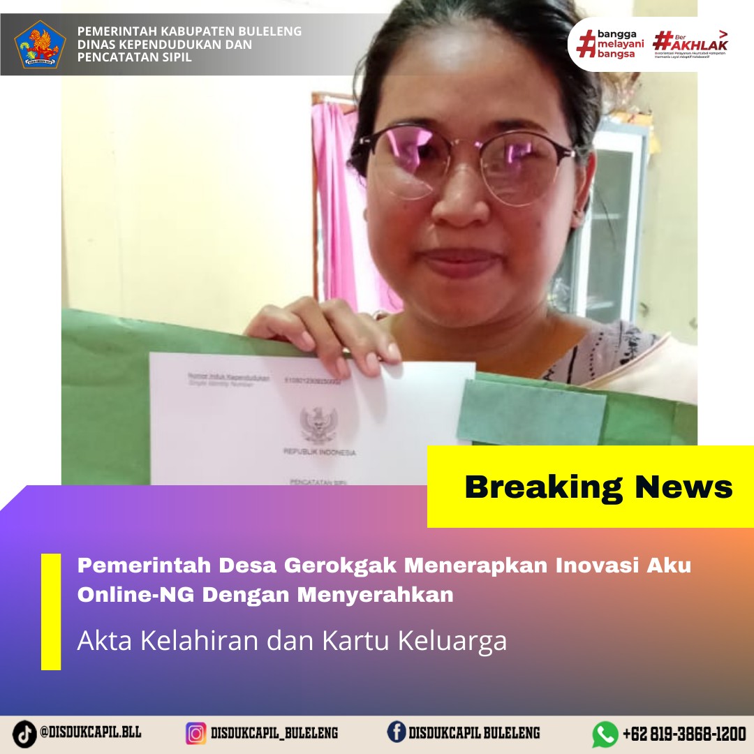 Pemerintah Kabupaten Buleleng melalui Dinas Kependudukan dan Pecatatan Sipil (Disdukcapil) Kabupaten Buleleng memaksimalkan serta mempermudah pelayanan kependudukan masyarakat dengan beberapa inovasi, melalui aplikasi AKU Online-NG. Dimana dalam penerapan aplikasi Aku Online-NG tersebut masyarakat tidak perlu lagi datang ke Dinas Dukcapil untuk melakukan pelayanan langsung cukup dengan datang ke Desa nanti akan dibantu oleh operator Desa masing-masing. Di Desa Gerokgak Kecamatan Gerokgak, telah diserahkan dokumen kependudukan berupa Akta Kelahiran atas nama I Kadek Harsa Surya Adnyana dan Kartu Keluarga atas nama I Gede Hary Krisna Semarandana yang diserahkan oleh Kelian Banjar Dinas Palbesi Desa Gerokgak, Selasa (2/12).