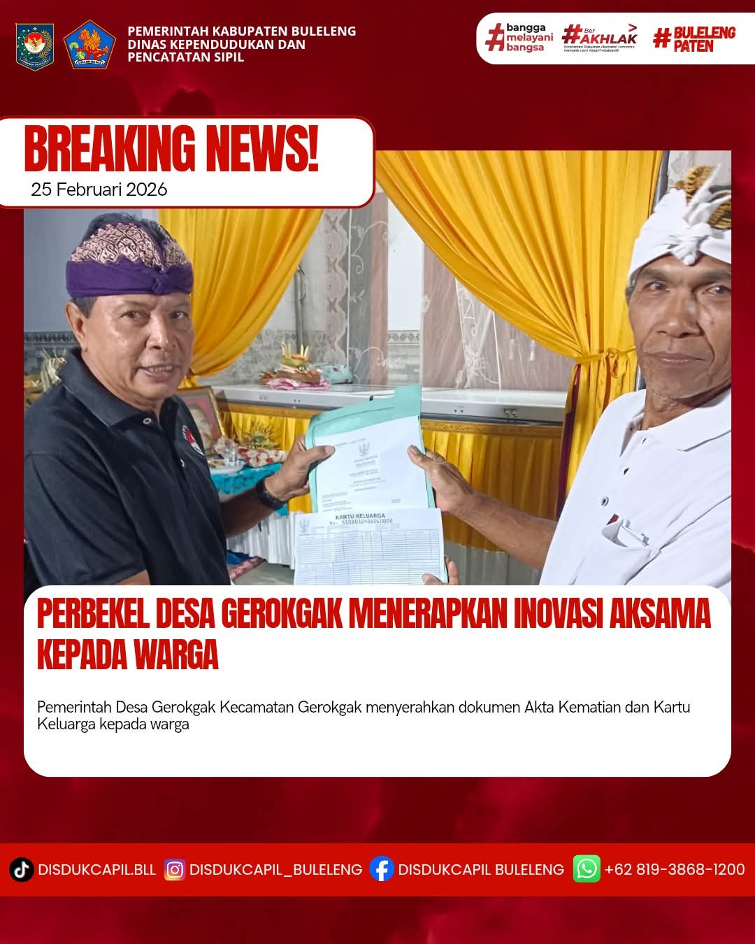 Pemerintah Kabupaten Buleleng melalui Dinas Kependudukan dan Pecatatan Sipil (Disdukcapil) Kabupaten Buleleng memaksimalkan serta mempermudah pelayanan kependudukan masyarakat dengan beberapa inovasi, yakni BALITA (Bayi Lahir Berakta), NYAKSI (Menyerahkan Akta Kawin Saat Acara Perkawinan) dan AKSAMA ( Akta Kematian Diserahkan Saat Masih Berduka) melalui aplikasi Aku Online-NG. Di Desa Gerokgak Kecamatan Gerokgak, telah diterapkan program Aksama (Akta Kematian Diserahkan Saat Masih Berduka) yang dilakukan secara langsung oleh Perbekel Desa Gerokgak I Nyoman Wijaya dengan menyerahkan Akta Kematian atas nama Gusti Putu Karya Nasa dan Kartu Keluarga atas nama Gusti Made Nayi warga Banjar Dinas Tamansari kepada keluarga almarhum di rumah duka Banjar Dinas Tamansari, Desa Gerokgak, Rabu (25/2).