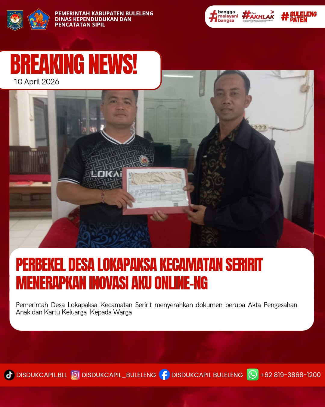 Pemerintah Kabupaten Buleleng melalui Dinas Kependudukan dan Pecatatan Sipil (Disdukcapil) Kabupaten Buleleng memaksimalkan serta mempermudah pelayanan kependudukan masyarakat dengan beberapa inovasi, melalui aplikasi AKU Online-NG. Dimana dalam penerapan aplikasi Aku Online-NG tersebut masyarakat tidak perlu lagi datang ke Dinas Dukcapil untuk melakukan pelayanan langsung, cukup dengan datang ke Desa nanti akan dibantu oleh operator Desa masing-masing. Di Desa Lokapaksa Kecamatan Seririt, telah diserahkan dokumen kependudukan berupa Akta Pengesahan Anak dan Kartu Keluarga yang diserahkan secara langsung oleh Perbekel Desa Lokapaksa Kecamatan Seririt Putu Dodik Tryana di Kantor Perbekel Desa Lokapaksa, Jumat (10/4).