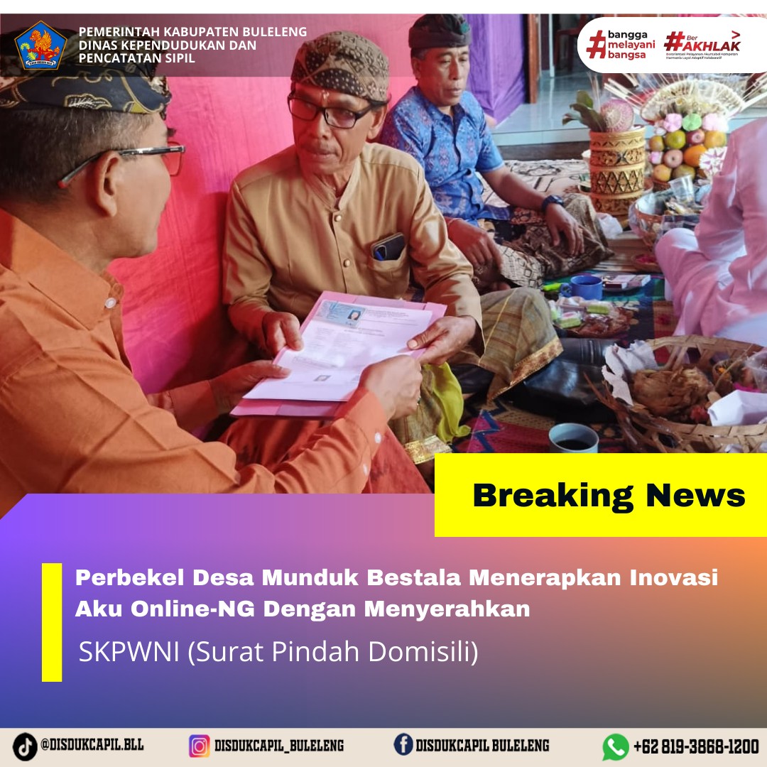 Pemerintah Kabupaten Buleleng melalui Dinas Kependudukan dan Pecatatan Sipil (Disdukcapil) Kabupaten Buleleng memaksimalkan serta mempermudah pelayanan kependudukan masyarakat dengan beberapa inovasi, melalui aplikasi AKU Online. Dimana dalam penerapan aplikasi Aku Online tersebut masyarakat tidak perlu lagi datang ke Dinas Dukcapil untuk melakukan pelayanan langsung cukup dengan datang ke Desa nanti akan dibantu oleh operator Desa masing-masing. Di Desa Munduk Bestala Kecamatan Seririt telah diserahkan dokumen kependudukan berupa SKPWNI antar Kabupaten yang diserahkan oleh Perbekel Desa Munduk Bestala I Putu Sriyasa, SH Desa Munduk Bestala Kecamatan Seririt, Minggu (28/9).