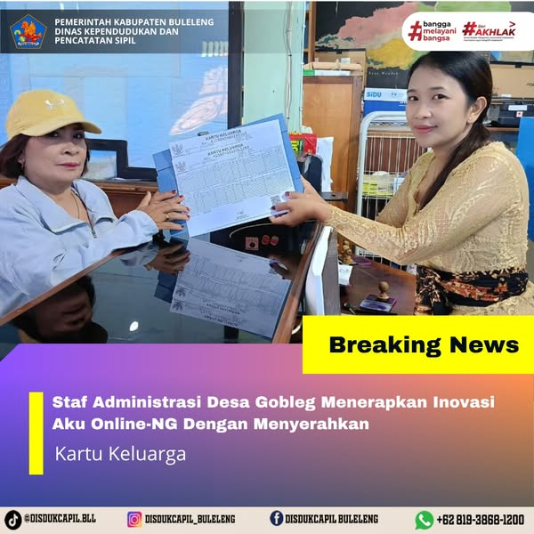 Pemerintah Kabupaten Buleleng melalui Dinas Kependudukan dan Pecatatan Sipil (Disdukcapil) Kabupaten Buleleng memaksimalkan serta mempermudah pelayanan kependudukan masyarakat dengan beberapa inovasi, melalui aplikasi AKU Online-NG. Dimana dalam penerapan aplikasi Aku Online-NG tersebut masyarakat tidak perlu lagi datang ke Dinas Dukcapil untuk melakukan pelayanan langsung cukup dengan datang ke Desa nanti akan dibantu oleh operator Desa masing-masing. Di Desa Gobleg Kecamatan Banjar, telah diserahkan dokumen kependudukan berupa Kartu Keluarga atas nama Putu Supartini yang diserahkan langsung oleh staf administrasi Desa Gobleg bertempat di Kantor Perbekel Desa Gobleg, Kecamatan Banjar, Kabupaten Buleleng, Selasa (5/8).