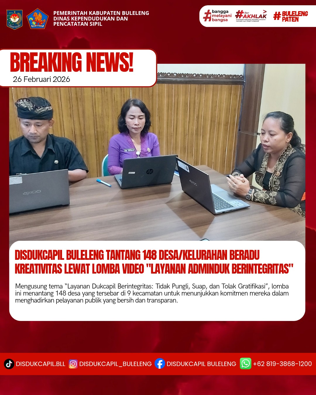 Dinas Kependudukan dan Pencatatan Sipil (Disdukcapil) Kabupaten Buleleng resmi meluncurkan kompetisi video antar desa dan kelurahan se-Kabupaten Buleleng. Mengusung tema “Layanan Dukcapil Berintegritas: Tidak Pungli, Suap, dan Tolak Gratifikasi”, lomba ini menantang 148 desa yang tersebar di 9 kecamatan untuk menunjukkan komitmen mereka dalam menghadirkan pelayanan publik yang bersih dan transparan.