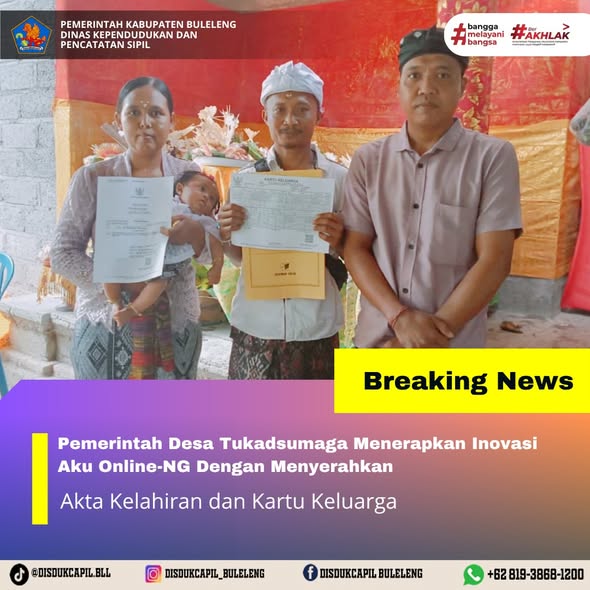 Pemerintah Kabupaten Buleleng melalui Dinas Kependudukan dan Pecatatan Sipil (Disdukcapil) Kabupaten Buleleng memaksimalkan serta mempermudah pelayanan kependudukan masyarakat dengan beberapa inovasi, melalui aplikasi AKU Online-NG. Dimana dalam penerapan aplikasi Aku Online-NG tersebut masyarakat tidak perlu lagi datang ke Dinas Dukcapil untuk melakukan pelayanan langsung cukup dengan datang ke Desa nanti akan dibantu oleh operator Desa masing-masing. Di Desa Tukadsumaga Kecamatan Gerokgak, telah diserahkan dokumen kependudukan berupa Akta Kelahiran atas nama KOMANG SWASTI dan kartu keluarga Atas nama I KETUT SUDARSANA yang diserahkan oleh Kelian Banjar Dinas Yehmas kepada warga Desa Tukadsumaga, Senin (10/11).