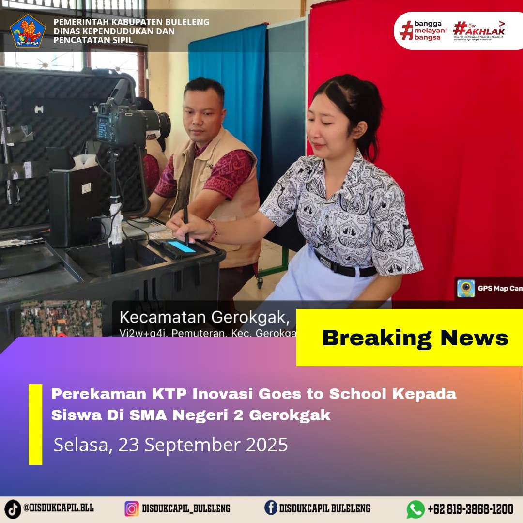 Pada kali ini Selasa, 23 September 2025 pelayanan perekaman KTP-el dilaksanakan di SMA Negeri 2 Gerokgak. Hasil perekaman di SMA Negeri 2 Gerokgak dengan data BNBA sebanyak 7 orang dan total yang melakukan perekaman sebanyak 60 orang, dimana hasil perekaman data di dalam BNBA yang melakukan perekaman sebanyak 3 orang dan data di luar BNBA sebanyak 57 orang yang melakukan perekaman. Sisa data dalam BNBA yang belum melakukan perekaman sebanyak 4 orang, keterangan dari pihak sekolah dari sisa BNBA, sisa BNBA 2 orang tidak sekolah, 1 orang berhenti dan 1 orang sakit.