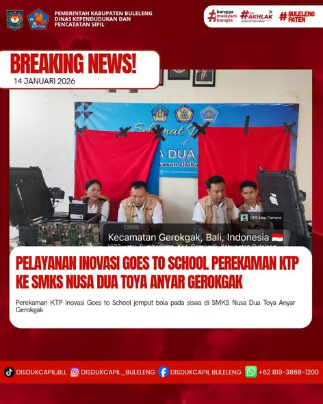 Pada kali ini Rabu, 14 Januari 2026 pelayanan perekaman KTP-el dilaksanakan di SMKS Nusa Dua Toya Anyar Gerokgak. Hasil perekaman di SMKS Nusa Dua Toya Anyar Gerokgak dengan data BNBA sebanyak 121 orang dan total yang melakukan perekaman sebanyak 73 orang, dimana hasil perekaman data di dalam BNBA sebanyak 65 dan di luar BNBA sebanyak 8 orang yang melakukan perekaman. Dilihat dari hasil tersebut sisa data BNBA yang belum perekaman sebanyak 56 orang keterangan dari pihak sekolah karena keterbatasan waktu sisa bnba dijadwalkan ulang.