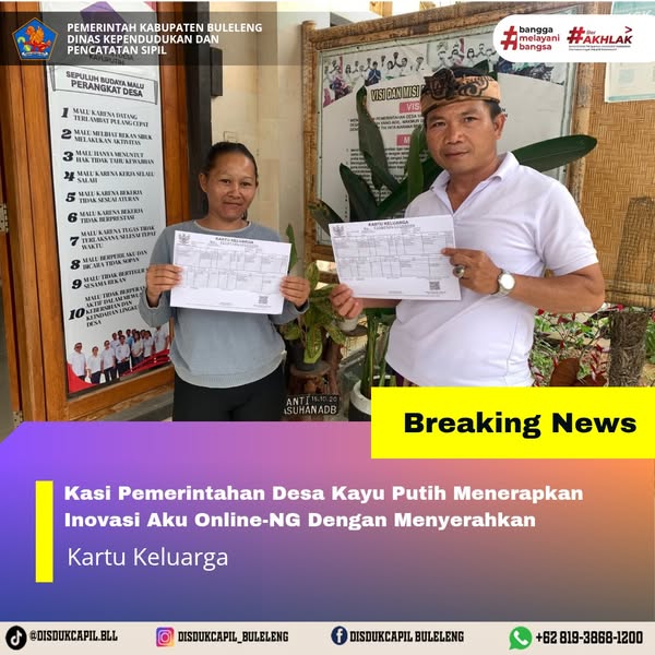 Pemerintah Kabupaten Buleleng melalui Dinas Kependudukan dan Pecatatan Sipil (Disdukcapil) Kabupaten Buleleng memaksimalkan serta mempermudah pelayanan kependudukan masyarakat dengan beberapa inovasi, melalui aplikasi AKU Online-NG. Dimana dalam penerapan aplikasi Aku Online-NG tersebut masyarakat tidak perlu lagi datang ke Dinas Dukcapil untuk melakukan pelayanan langsung cukup dengan datang ke Desa nanti akan dibantu oleh operator Desa masing-masing. Di Desa Kayuputih Kecamatan Sukasada, telah diserahkan dokumen kependudukan berupa Kartu Keluarga atas nama Komang Dersana yang diserahkan langsung oleh Kasi Pemerintahan Desa Kayuputih Kecamatan Sukasada bertempat di kantor Perbekel Desa Kayuputih, Kecamatan Sukasada, Kabupaten Buleleng, Senin (25/8).