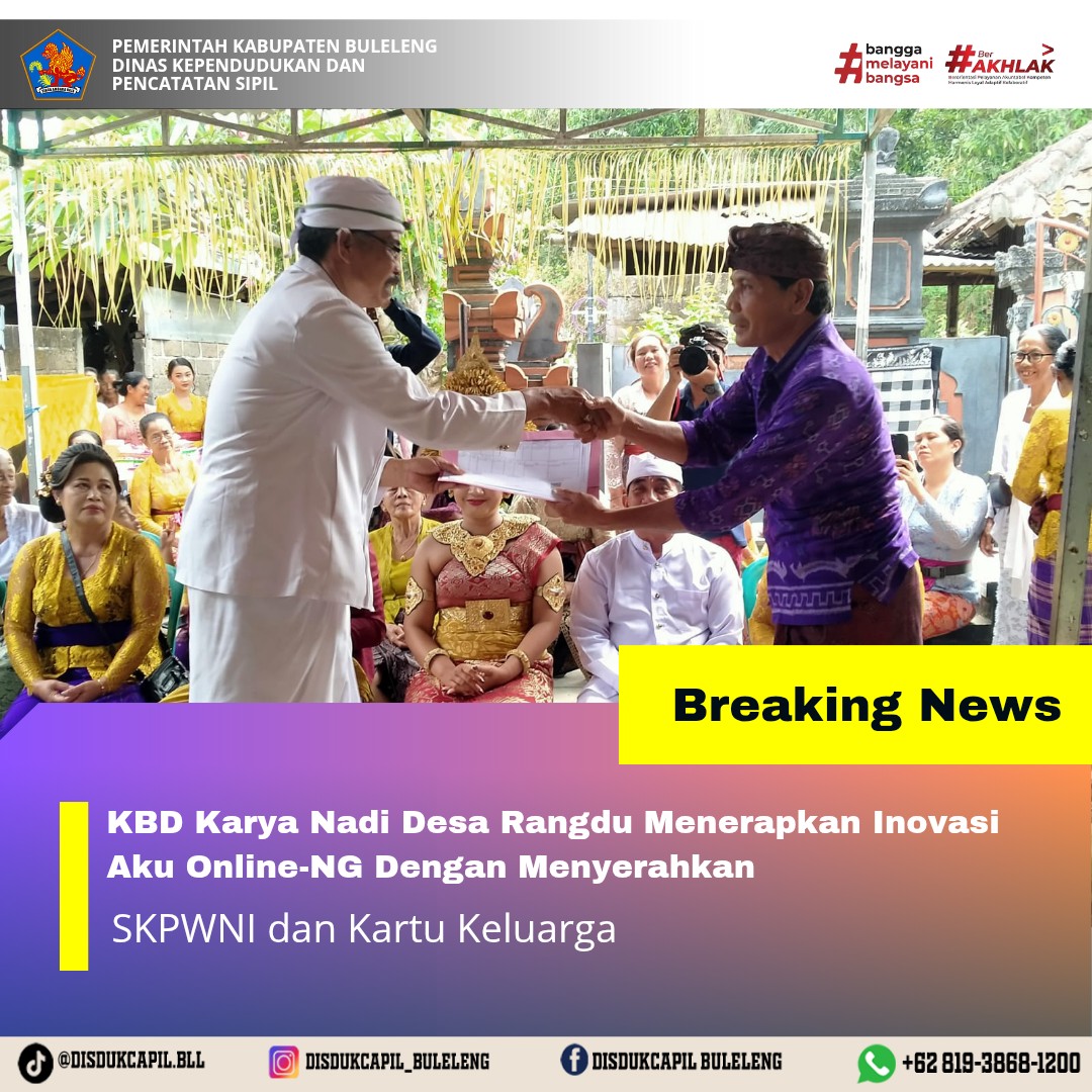 Pemerintah Kabupaten Buleleng melalui Dinas Kependudukan dan Pecatatan Sipil (Disdukcapil) Kabupaten Buleleng memaksimalkan serta mempermudah pelayanan kependudukan masyarakat dengan beberapa inovasi, melalui aplikasi AKU Online. Dimana dalam penerapan aplikasi Aku Online tersebut masyarakat tidak perlu lagi datang ke Dinas Dukcapil untuk melakukan pelayanan langsung cukup dengan datang ke Desa nanti akan dibantu oleh operator Desa masing-masing. Di Desa Rangdu Kecamatan Seririt telah diserahkan dokumen kependudukan berupa SKPWNI antar Kecamatan atas nama Putu Ayu Pramita dan Kartu Keluarga atas nama I Made Tegeh yang diserahkan oleh Kelian Banjar Dinas Karya Nadi Desa Rangdu Kecamatan Seririt, Senin (29/9).