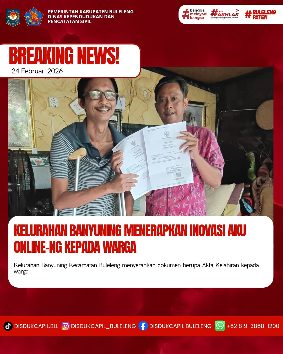 Pemerintah Kabupaten Buleleng melalui Dinas Kependudukan dan Pecatatan Sipil (Disdukcapil) Kabupaten Buleleng memaksimalkan serta mempermudah pelayanan kependudukan masyarakat dengan beberapa inovasi, melalui aplikasi AKU Online-NG. Dimana dalam penerapan aplikasi Aku Online-NG tersebut masyarakat tidak perlu lagi datang ke Dinas Dukcapil untuk melakukan pelayanan langsung cukup dengan datang ke Desa nanti akan dibantu oleh operator Desa masing-masing. Di Kelurahan Banyuning Kecamatan Buleleng, telah diserahkan dokumen kependudukan berupa Akta Kelahiran hilang warga Kelurahan Banyuning yang diserahkan langsung oleh Kelurahan Banyuning Kecamatan Buleleng, Kabupaten Buleleng, Selasa (24/2).