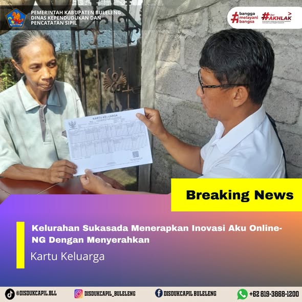 Pemerintah Kabupaten Buleleng melalui Dinas Kependudukan dan Pecatatan Sipil (Disdukcapil) Kabupaten Buleleng memaksimalkan serta mempermudah pelayanan kependudukan masyarakat dengan beberapa inovasi, melalui aplikasi AKU Online-NG. Dimana dalam penerapan aplikasi Aku Online-NG tersebut masyarakat tidak perlu lagi datang ke Dinas Dukcapil untuk melakukan pelayanan langsung cukup dengan datang ke Desa nanti akan dibantu oleh operator Desa masing-masing. Di Kelurahan Sukasada Kecamatan Sukasada, telah diserahkan dokumen kependudukan berupa Kartu Keluarga atas nama Made Surya Ista yang beralamat di Lingkungan Lumbanan, Kelurahan Sukasada yang diserahkan secara Operator Kelurahan Sukasada kepada warga, Rabu (10/12).