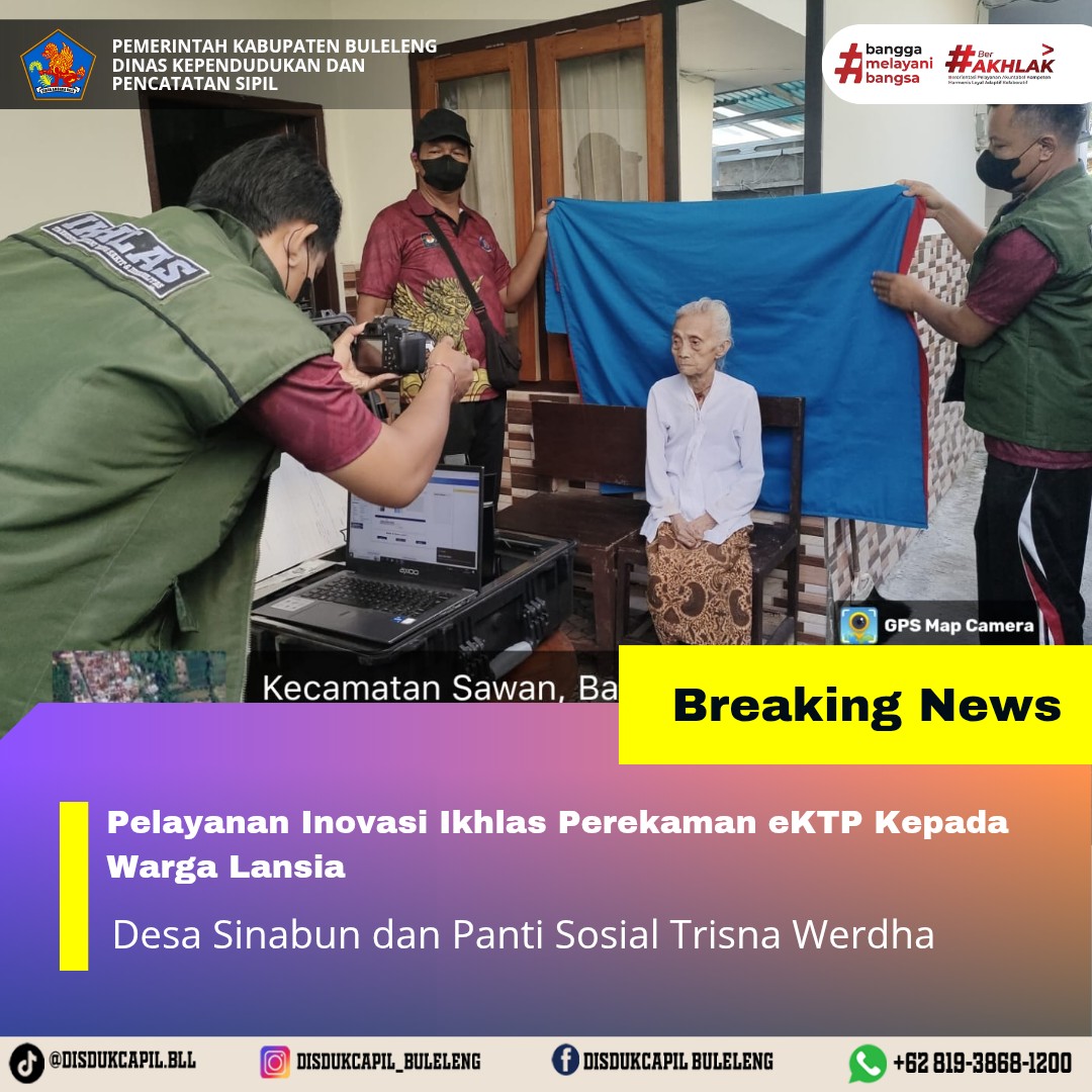 Dinas Kependudukan dan Pencatatan Sipil Kabupaten Buleleng terus berupaya memberikan pelayanan maksimal pada masyarakat dalam rangka meningkatkan kesadaran kepada masyarakat akan pentingnya memiliki dokumen kependudukan salah satunya Kartu Tanda Penduduk (KTP). Berbagai macam inovasi dikembangkan untuk mempermudah masyarakat dapat memiliki dokumen kependudukan. Salah satu Inovasi yang diberikan kepada masyarakat adalah Inovasi "IKHLAS" (Tim Khusus Layanan Untuk Orang Sakit dan Disabilitas) yaitu jembut bola perekaman KTP-el ke rumah warga yang tidak bisa datang langsung ke Kantor Disdukcapil untuk melakukan perekaman eKTP. Sesuai dengan Undang-Undang Republik Indonesia Nomor 24 Tahun 2013 tentang Administrasi Kependudukan, menyatakan bahwa Penduduk Warga Negara Indonesia dan Orang Asing yang memiliki Izin Tinggal Tetap yang telah berumur 17 (tujuh belas) tahun atau telah kawin atau pernah kawin wajib memiliki KTP-el. Namun demikian, ada beberapa penduduk yang tidak bisa datang langsung ke Kantor Dinas Kependudukan dan Pencatatan Sipil Kabupaten Buleleng karena kendala kesehatan dan usia lanjut.