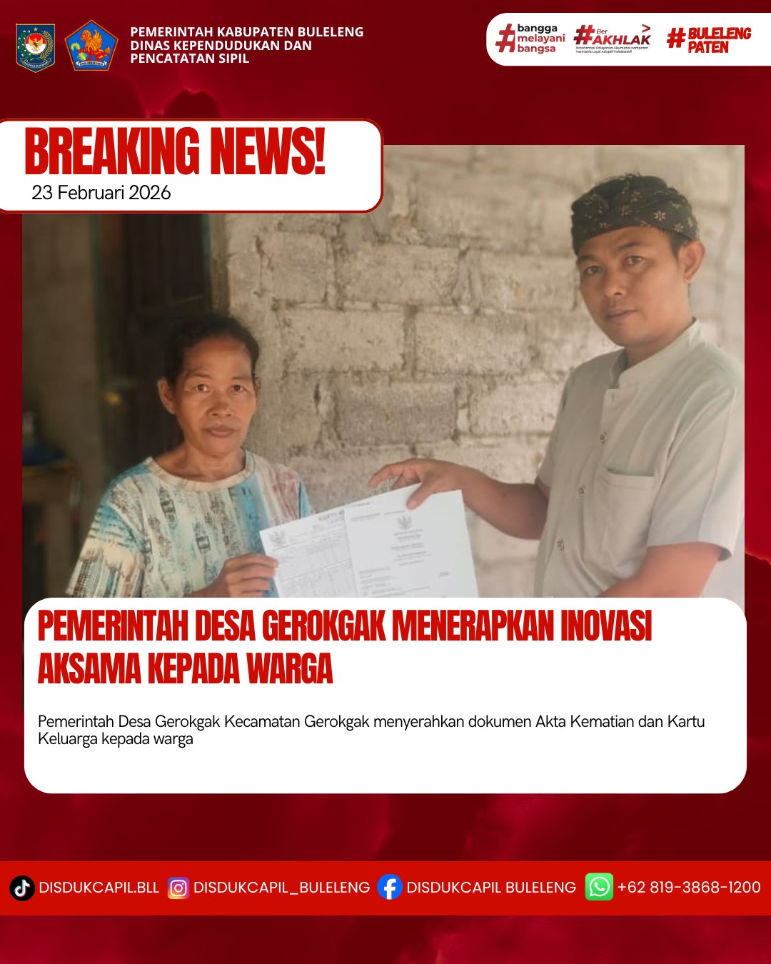 Pemerintah Kabupaten Buleleng melalui Dinas Kependudukan dan Pecatatan Sipil (Disdukcapil) Kabupaten Buleleng memaksimalkan serta mempermudah pelayanan kependudukan masyarakat dengan beberapa inovasi, yakni BALITA (Bayi Lahir Berakta), NYAKSI (Menyerahkan Akta Kawin Saat Acara Perkawinan) dan AKSAMA ( Akta Kematian Diserahkan Saat Masih Berduka) melalui aplikasi Aku Online-NG. Di Desa Gerokgak Kecamatan Gerokgak, telah diterapkan program Aksama (Akta Kematian Diserahkan Saat Masih Berduka) yang dilakukan secara langsung oleh Kelian Banjar Dinas Batuagung Pidada dengan menyerahkan Akta Kematian atas nama Ketut Adit Sastrawan dan Kartu Keluarga atas nama I Ketut Parina kepada keluarga almarhum di rumah duka Desa Gerokgak, Senin (23/2).