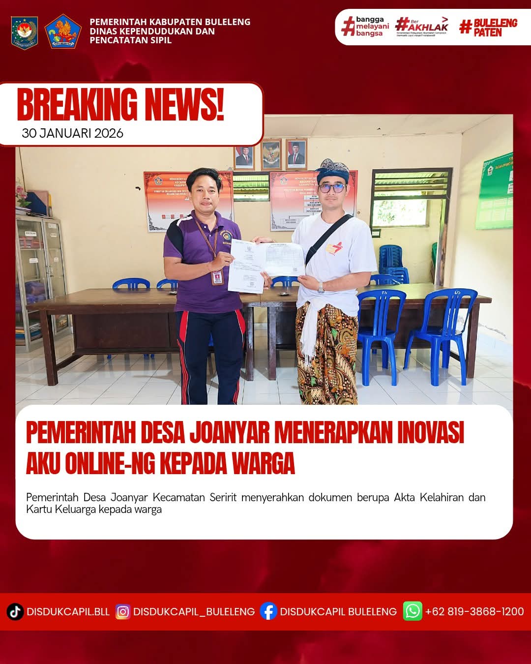 Pemerintah Kabupaten Buleleng melalui Dinas Kependudukan dan Pecatatan Sipil (Disdukcapil) Kabupaten Buleleng memaksimalkan serta mempermudah pelayanan kependudukan masyarakat dengan beberapa inovasi, melalui aplikasi AKU Online-NG. Dimana dalam penerapan aplikasi Aku Online-NG tersebut masyarakat tidak perlu lagi datang ke Dinas Dukcapil untuk melakukan pelayanan langsung cukup dengan datang ke Desa nanti akan dibantu oleh operator Desa masing-masing. Di Desa Joanyar Kecamatan Seririt, telah diserahkan dokumen kependudukan berupa Akta Kelahiran dan Kartu Keluarga atas nama Komang Yogik Sastrawan yang beralamat di Desa Joanyar yang diserahkan secara langsung oleh Kasi Pemerintahan Desa Joanyar Kecamatan Seririt, Jumat (30/1).