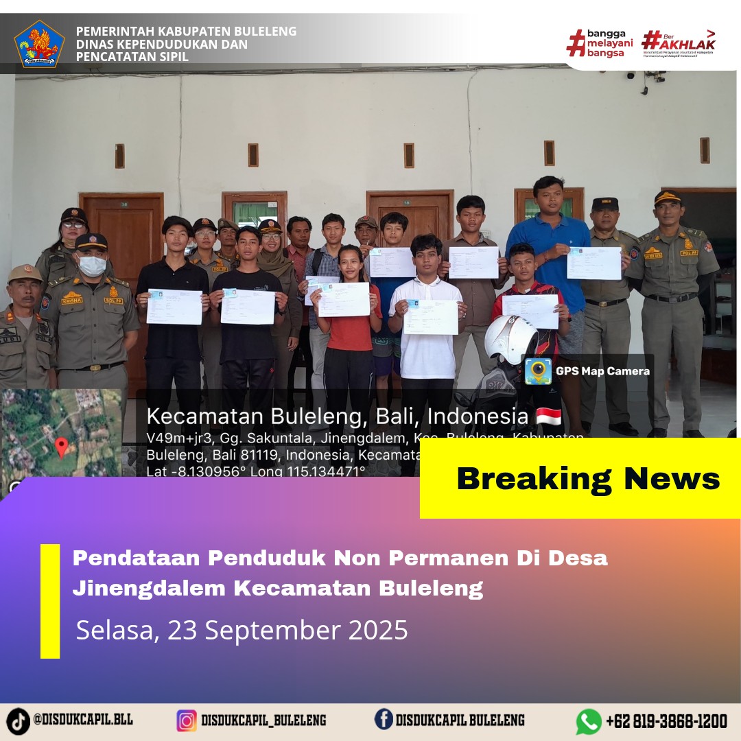 Kali ini Selasa, 23 September 2025, Dinas Kependudukan dan Pencatatan Sipil Kabupaten Buleleng melaksanakan kegiatan pendataan penduduk Non Permanen di Desa Jinengdalem Kecamatan Buleleng. Dari pendataan penduduk kali ini didapatkan hasil :