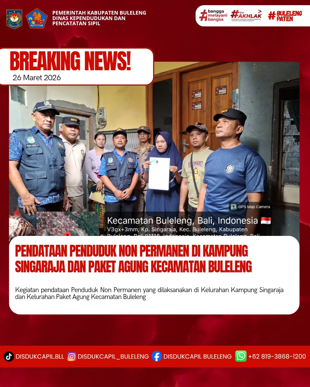 Kali ini Kamis, 26 Maret 2026, Dinas Kependudukan dan Pencatatan Sipil Kabupaten Buleleng melaksanakan kegiatan pendataan penduduk Non Permanen di Kelurahan Kampung Singaraja dan Kelurahan Paket Agung Kecamatan Buleleng. Dari pendataan penduduk kali ini diperoleh hasil :