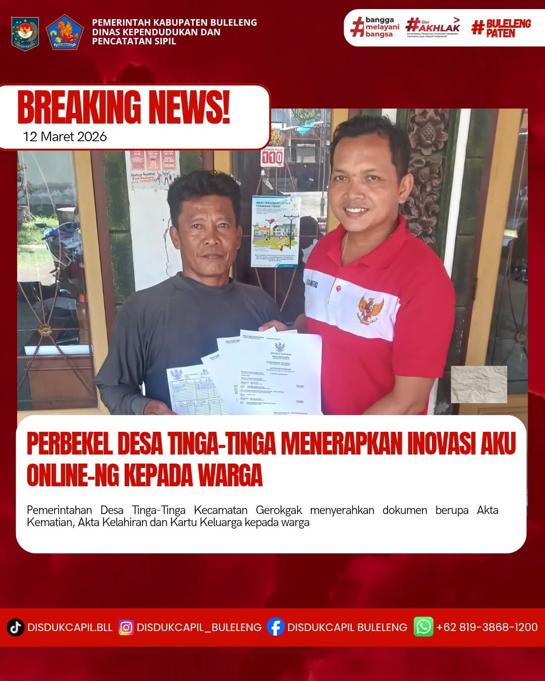Pemerintah Kabupaten Buleleng melalui Dinas Kependudukan dan Pecatatan Sipil (Disdukcapil) Kabupaten Buleleng memaksimalkan serta mempermudah pelayanan kependudukan masyarakat dengan beberapa inovasi, melalui aplikasi AKU Online-NG. Dimana dalam penerapan aplikasi Aku Online-NG tersebut masyarakat tidak perlu lagi datang ke Dinas Dukcapil untuk melakukan pelayanan langsung cukup dengan datang ke Desa nanti akan dibantu oleh operator Desa masing-masing. Di Desa Tinga-Tinga Kecamatan Gerokgak, telah diserahkan dokumen kependudukan berupa Akta Kematian atas nama Gede Kuningan, akta kelahiran atas nama Komang Hartawan dan Luh Kartika dan Kartu Keluarga baru atas nama Komang Hartawan, Banjar Dinas Bubunan Desa Tinga-Tinga Kecamatan Gerokgak yang diserahkan oleh Perbekel Desa Tinga-Tinga Komang Adi Wirawan di Desa Tinga-Tinga, Kamis (12/3).