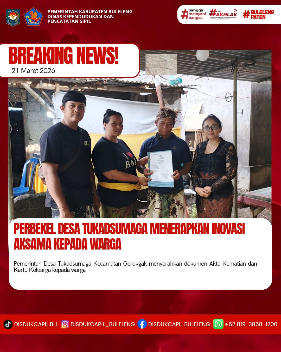 Pemerintah Kabupaten Buleleng melalui Dinas Kependudukan dan Pecatatan Sipil (Disdukcapil) Kabupaten Buleleng memaksimalkan serta mempermudah pelayanan kependudukan masyarakat dengan beberapa inovasi, yakni BALITA (Bayi Lahir Berakta), NYAKSI (Menyerahkan Akta Kawin Saat Acara Perkawinan) dan AKSAMA (Akta Kematian Diserahkan Saat Masih Berduka) melalui aplikasi Aku Online. Di Desa Tukadsumaga Kecamatan Gerokgak, telah diterapkan program Aksama (Akta Kematian Diserahkan Saat Masih Berduka) yang dilakukan secara langsung oleh Perbekel Tukadsumaga ANAK AGUNG SRI WATHI dengan menyerahkan Akta Kematian atas nama NI LUH KERNING dan Kartu Keluarga kepada pihak keluarga almarhum di Desa Tukadusumaga Kecamatan Gerokgak, Sabtu (21/3).