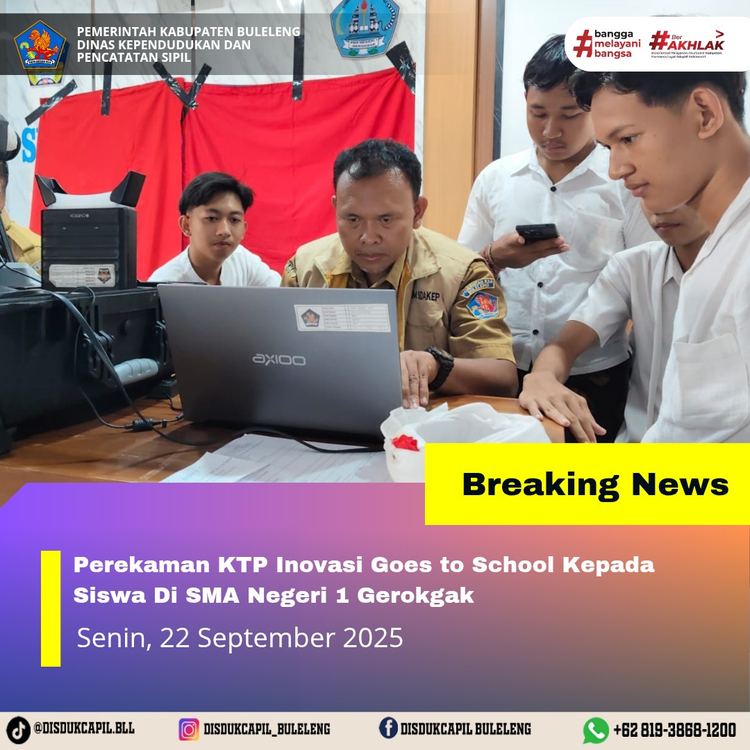 Pada kali ini Senin, 22 September 2025 pelayanan perekaman KTP-el dilaksanakan di SMA Negeri 1 Gerokgak. Hasil perekaman di SMA Negeri 1 Gerokgak dengan data BNBA sebanyak 62 orang dan total yang melakukan perekaman sebanyak 84 orang, dimana hasil perekaman data di dalam BNBA yang melakukan perekaman sebanyak 8 orang dan data di luar BNBA sebanyak 76 orang yang melakukan perekaman. Sisa data dalam BNBA yang belum melakukan perekaman sebanyak 54 orang, keterangan dari pihak sekolah dari sisa BNBA, bahwa sisa BNBA sudah diumumkan dan dicari kekelas oleh gurunya tetapi tidak hadir perekaman dan kendala yang dialami listrik sekolah hidup mati.