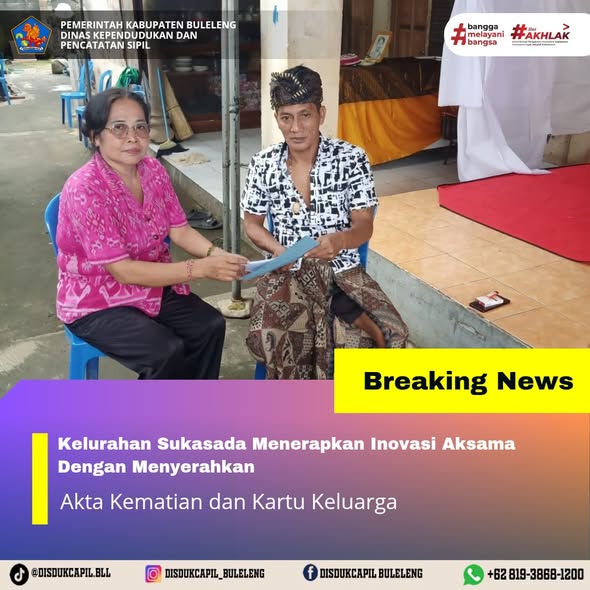 Pemerintah Kabupaten Buleleng melalui Dinas Kependudukan dan Pecatatan Sipil (Disdukcapil) Kabupaten Buleleng memaksimalkan serta mempermudah pelayanan kependudukan masyarakat dengan beberapa inovasi, yakni BALITA (Bayi Lahir Berakta), NYAKSI (Menyerahkan Akta Kawin Saat Acara Perkawinan) dan AKSAMA ( Akta Kematian Diserahkan Saat Masih Berduka) melalui aplikasi Aku Online-NG. Di Kelurahan Sukasada Kecamatan Sukasada, telah diterapkan program Aksama (Akta Kematian Diserahkan Saat Masih Berduka) yang dilakukan secara langsung oleh Plt. Kepala Lingkungan Sukasada dengan menyerahkan Akta Kematian atas nama I Made Deres dan Kartu Keluarga atas nama Gede Sugiartama kepada keluarga almarhum di Rumah Duka yang beralamat di Lingkungan Bakung, Kelurahan Sukasada, Selasa (16/12).