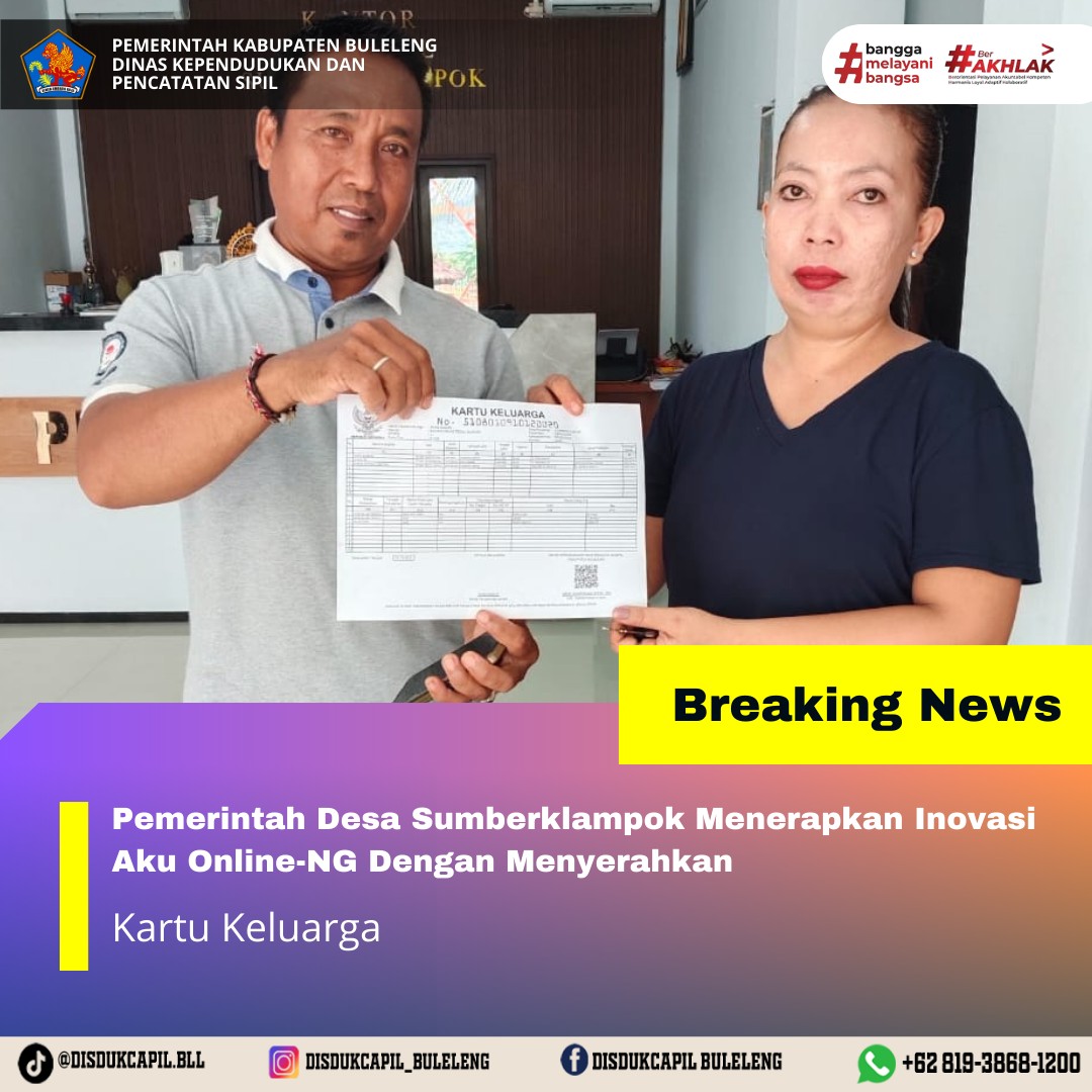 Pemerintah Kabupaten Buleleng melalui Dinas Kependudukan dan Pecatatan Sipil (Disdukcapil) Kabupaten Buleleng memaksimalkan serta mempermudah pelayanan kependudukan masyarakat dengan beberapa inovasi, melalui aplikasi AKU Online-NG. Dimana dalam penerapan aplikasi Aku Online-NG tersebut masyarakat tidak perlu lagi datang ke Dinas Dukcapil untuk melakukan pelayanan langsung cukup dengan datang ke Desa nanti akan dibantu oleh operator Desa masing-masing. Di Desa Sumberklampok Kecamatan Gerokgak, telah diserahkan dokumen kependudukan berupa Kartu Keluarga atas nama Iwan Sanusi warga Desa Sumberklampok Kecamatan Gerokgak yang diserahkan secara langsung oleh Ketua BPD Bapak I Made Sukardana bertempat di kantor Perbekel Desa Sumberklampok, Kecamatan Gerokgak, Kamis (27/11).