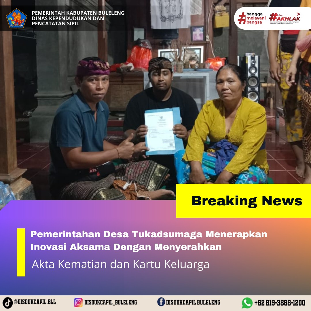 Pemerintah Kabupaten Buleleng melalui Dinas Kependudukan dan Pecatatan Sipil (Disdukcapil) Kabupaten Buleleng memaksimalkan serta mempermudah pelayanan kependudukan masyarakat dengan beberapa inovasi, yakni BALITA (Bayi Lahir Berakta), NYAKSI (Menyerahkan Akta Kawin Saat Acara Perkawinan) dan AKSAMA ( Akta Kematian Diserahkan Saat Masih Berduka) melalui aplikasi Aku Online. Di Desa Tukadsumaga Kecamatan Gerokgak, telah diterapkan program Aksama (Akta Kematian Diserahkan Saat Masih Berduka) yang dilakukan secara langsung oleh Kelian Banjar Dinas Mawar Desa Tukadsumaga dengan menyerahkan Akta Kematian atas nama I Made Widana dan Kartu Keluarga Ni Ketut Simpen di Desa Tukadusumaga Kecamatan Gerokgak, Minggu (28/9).