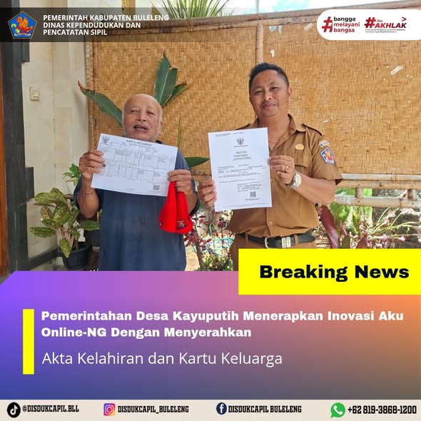 Pemerintah Kabupaten Buleleng melalui Dinas Kependudukan dan Pecatatan Sipil (Disdukcapil) Kabupaten Buleleng memaksimalkan serta mempermudah pelayanan kependudukan masyarakat dengan beberapa inovasi, melalui aplikasi AKU Online-NG. Dimana dalam penerapan aplikasi Aku Online-NG tersebut masyarakat tidak perlu lagi datang ke Dinas Dukcapil untuk melakukan pelayanan langsung cukup dengan datang ke Desa nanti akan dibantu oleh operator Desa masing-masing. Di Desa Kayuputih Kecamatan Sukasada, telah diserahkan dokumen kependudukan berupa Akta Kelahiran atas nama Wayan Sumedani dan Kartu Keluarga atas nama Ketut Mester warga Banjar Dinas Kayuputih, Desa Kayu Putih, Kecamatan Sukasada yang diserahkan secara langsung oleh Kelian Banjar Dinas Kayuputih, Desa Kayuputih Kecamatan Sukasada, Senin (22/12).