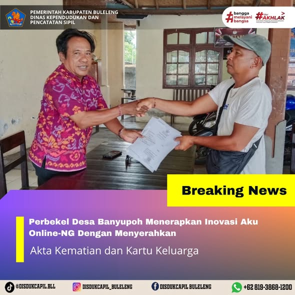 Pemerintah Kabupaten Buleleng melalui Dinas Kependudukan dan Pecatatan Sipil (Disdukcapil) Kabupaten Buleleng memaksimalkan serta mempermudah pelayanan kependudukan masyarakat dengan beberapa inovasi, melalui aplikasi AKU Online. Dimana dalam penerapan aplikasi Aku Online tersebut masyarakat tidak perlu lagi datang ke Dinas Dukcapil untuk melakukan pelayanan langsung cukup dengan datang ke Desa nanti akan dibantu oleh operator Desa masing-masing. Di Desa Banyupoh Kecamatan Gerokgak telah diserahkan dokumen kependudukan berupa Akta Kematian dan Kartu Keluarga atas nama Nengah Suma beralamat Banjar Dinas Banyupoh, Desa Banyupoh Kecamatan Gerokgak yang diserahkan oleh Perbekel Banyupoh Bapak Putu Sukerata Desa Banyupoh Kecamatan Gerokgak, Selasa (11/11).