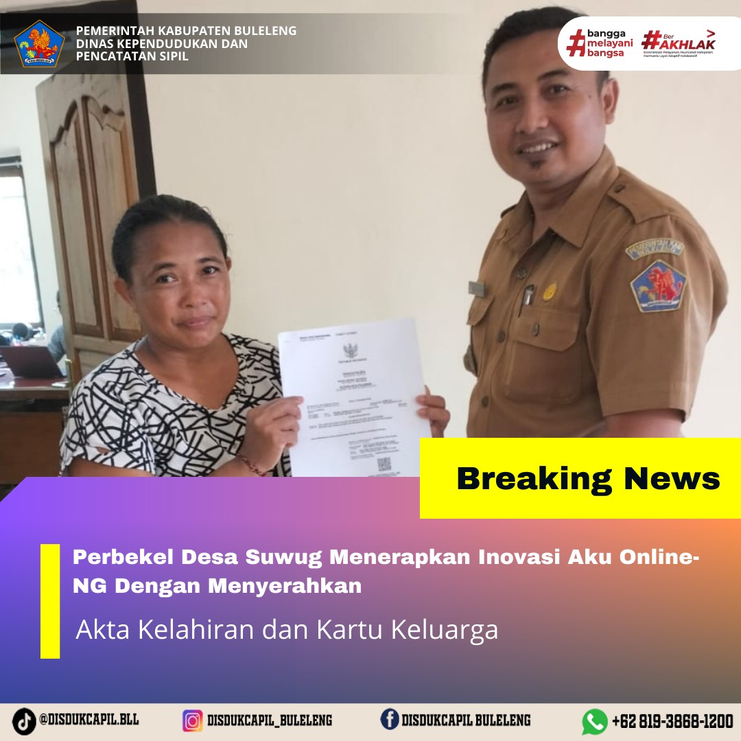 Pemerintah Kabupaten Buleleng melalui Dinas Kependudukan dan Pecatatan Sipil (Disdukcapil) Kabupaten Buleleng memaksimalkan serta mempermudah pelayanan kependudukan masyarakat dengan beberapa inovasi, melalui aplikasi AKU Online-NG. Dimana dalam penerapan aplikasi Aku Online-NG tersebut masyarakat tidak perlu lagi datang ke Dinas Dukcapil untuk melakukan pelayanan langsung cukup dengan datang ke Desa nanti akan dibantu oleh operator Desa masing-masing. Di Desa Suwug Kecamatan Sawan, Bapak Perbekel Desa suwug KETUT SUADNYANA,SE telah menyerahkan dokumen kependudukan berupa Akta Kelahiran dan Kartu Keluarga yang diserahkan secara lansung oleh Perbekel Desa Suwug, Senin (24/11).