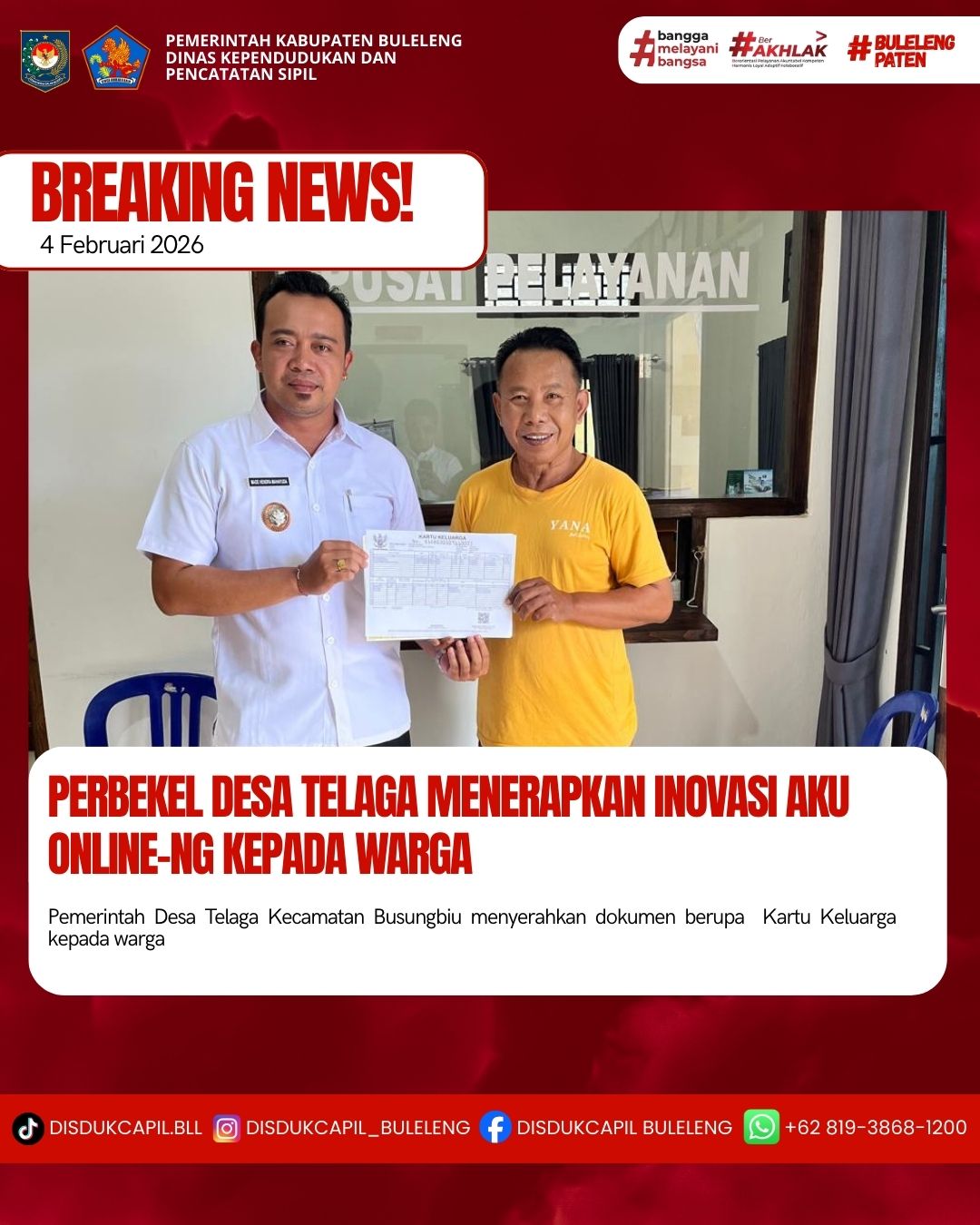 Pemerintah Kabupaten Buleleng melalui Dinas Kependudukan dan Pecatatan Sipil (Disdukcapil) Kabupaten Buleleng memaksimalkan serta mempermudah pelayanan kependudukan masyarakat dengan beberapa inovasi, melalui aplikasi AKU Online-NG. Dimana dalam penerapan aplikasi Aku Online-NG tersebut masyarakat tidak perlu lagi datang ke Dinas Dukcapil untuk melakukan pelayanan langsung cukup dengan datang ke Desa nanti akan dibantu oleh operator Desa masing-masing. Di Desa Telaga Kecamatan Busungbiu, telah diserahkan dokumen kependudukan berupa Kartu Keluarga atas nama Wayan Baskara yang diserahkan langsung oleh Perbekel Desa Telaga MADE HENDRA MAHAYUDA,S.PD bertempat di Kantor Perbekel Desa Telaga, Kecamatan Busungbi, Kabupaten Buleleng, Rabu (4/2).
