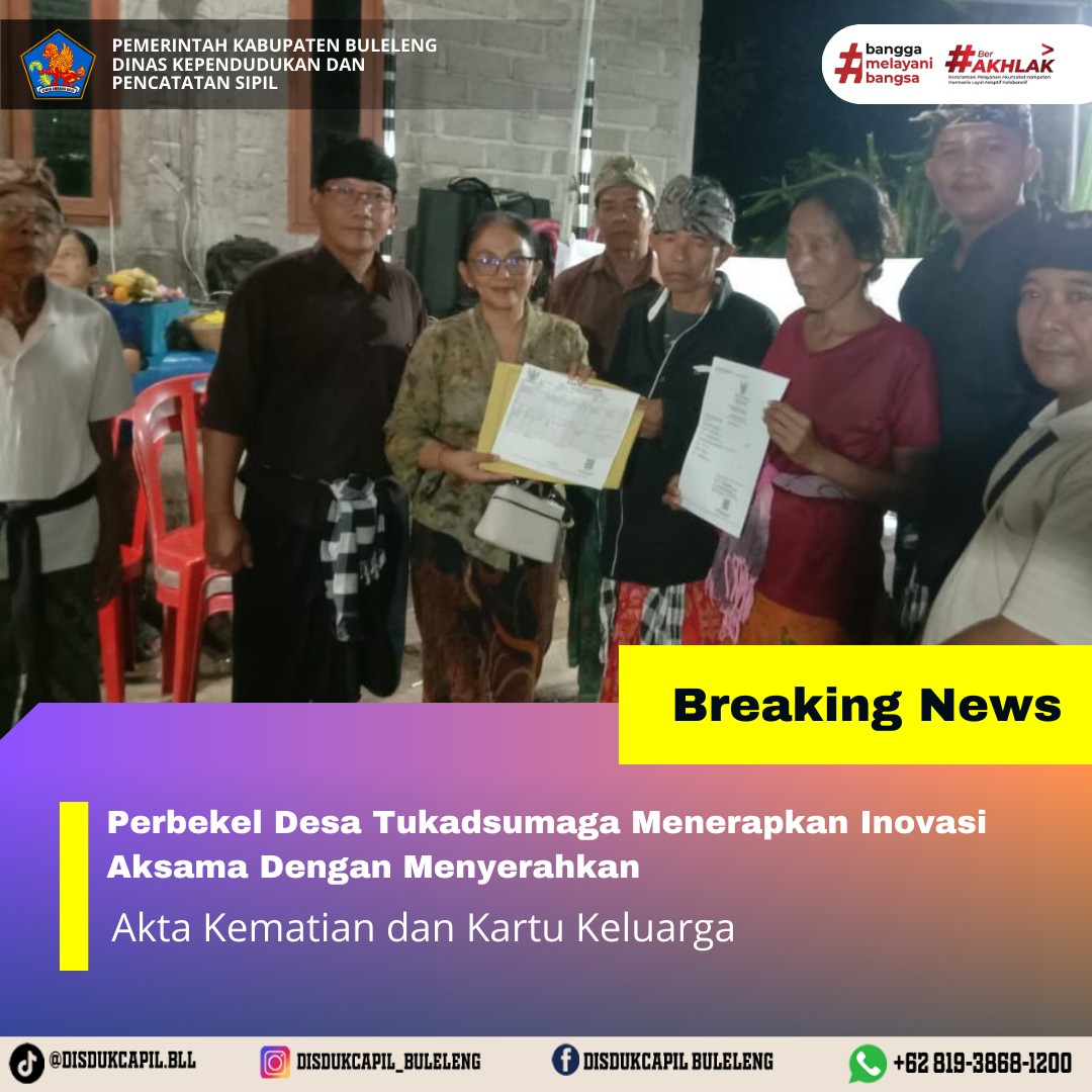Pemerintah Kabupaten Buleleng melalui Dinas Kependudukan dan Pecatatan Sipil (Disdukcapil) Kabupaten Buleleng memaksimalkan serta mempermudah pelayanan kependudukan masyarakat dengan beberapa inovasi, yakni BALITA (Bayi Lahir Berakta), NYAKSI (Menyerahkan Akta Kawin Saat Acara Perkawinan) dan AKSAMA ( Akta Kematian Diserahkan Saat Masih Berduka) melalui aplikasi Aku Online. Di Desa Tukadsumaga Kecamatan Gerokgak, telah diterapkan program Aksama (Akta Kematian Diserahkan Saat Masih Berduka) yang dilakukan secara langsung oleh Perbekel Desa Tukadsumaga ANAK AGUNG SRI WATHI dengan menyerahkan Akta Kematian atas nama I PUTU YOGIK PRATAMA dan Kartu Keluarga atas nama I WAYAN LASTRA di Desa Tukadusumaga Kecamatan Gerokgak, Selasa (2/9).