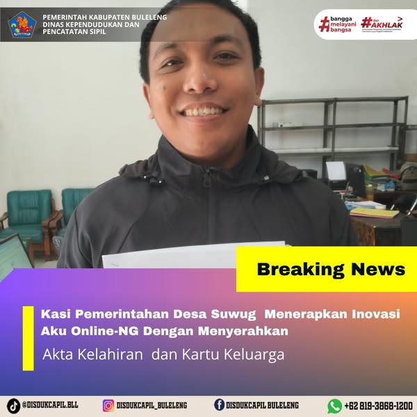Pemerintah Kabupaten Buleleng melalui Dinas Kependudukan dan Pecatatan Sipil (Disdukcapil) Kabupaten Buleleng memaksimalkan serta mempermudah pelayanan kependudukan masyarakat dengan beberapa inovasi, melalui aplikasi AKU Online-NG. Dimana dalam penerapan aplikasi Aku Online-NG tersebut masyarakat tidak perlu lagi datang ke Dinas Dukcapil untuk melakukan pelayanan langsung cukup dengan datang ke Desa nanti akan dibantu oleh operator Desa masing-masing. Di Desa Suwug Kecamatan Sawan, telah diserahkan dokumen kependudukan berupa Akta Kelahiran dan Kartu Keluarga yang diserahkan secara langsung oleh Kasi Pemerintahan Desa Suwug, Kamis (9/10).