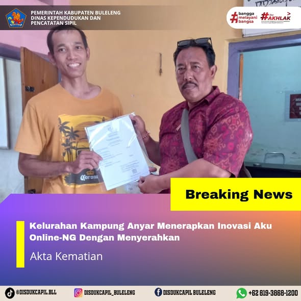 Pemerintah Kabupaten Buleleng melalui Dinas Kependudukan dan Pecatatan Sipil (Disdukcapil) Kabupaten Buleleng memaksimalkan serta mempermudah pelayanan kependudukan masyarakat dengan beberapa inovasi, melalui aplikasi AKU Online-NG. Dimana dalam penerapan aplikasi Aku Online-NG tersebut masyarakat tidak perlu lagi datang ke Dinas Dukcapil untuk melakukan pelayanan langsung cukup dengan datang ke Desa nanti akan dibantu oleh operator Desa masing-masing. Di Kelurahan Kampung Anyar Kecamatan Buleleng, telah diserahkan dokumen kependudukan berupa Akta Kematian atas nama Nyoman Kariasih yang diserahkan langsung oleh Kelurahan Kampung Anyar Kecamatan Buleleng, Kabupaten Buleleng, Selasa (23/12).