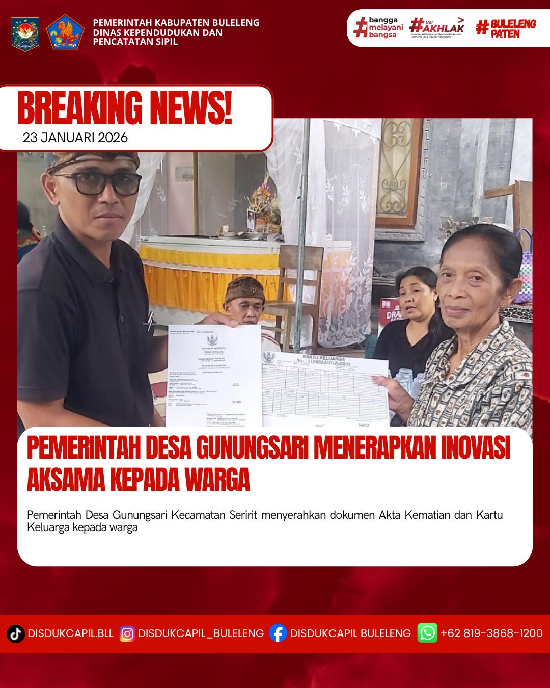 Pemerintah Kabupaten Buleleng melalui Dinas Kependudukan dan Pecatatan Sipil (Disdukcapil) Kabupaten Buleleng memaksimalkan serta mempermudah pelayanan kependudukan masyarakat dengan beberapa inovasi, yakni BALITA (Bayi Lahir Berakta), NYAKSI (Menyerahkan Akta Kawin Saat Acara Perkawinan) dan AKSAMA ( Akta Kematian Diserahkan Saat Masih Berduka) melalui aplikasi Aku Online. Di Desa Gunungsari Kecamatan Seririt, telah diterapkan program Aksama (Akta Kematian Diserahkan Saat Masih Berduka) yang dilakukan secara langsung oleh Pemerintah Desa Gunungsari dengan menyerahkan Akta Kematian atas nama I Ketut Tamat dan Kartu Keluarga atas nama Ni Nengah Susanti di Banjar Dinas Sekar Desa Gunungsari, Kecamatan Seririt, Jumat (23/1).