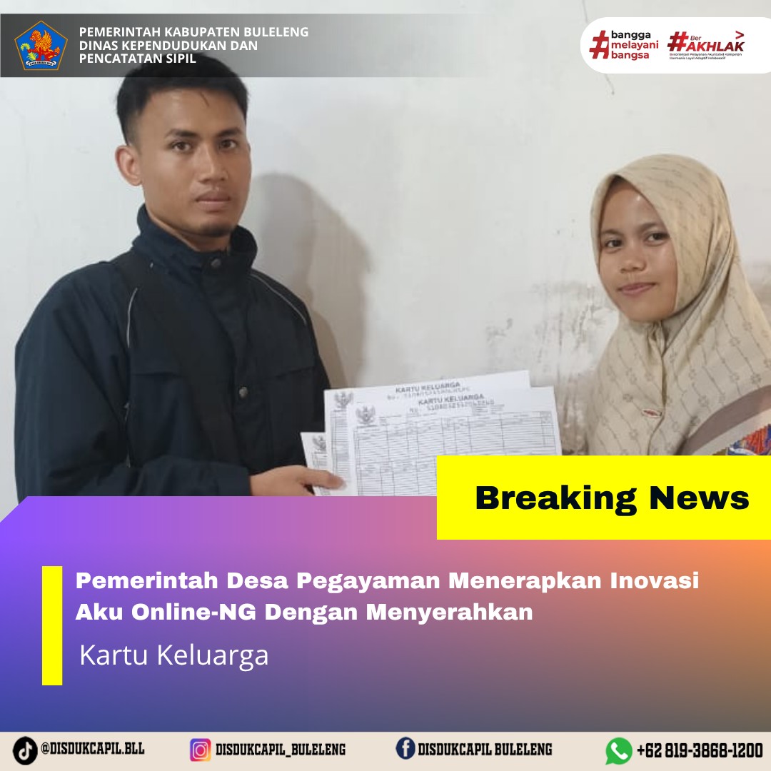Pemerintah Kabupaten Buleleng melalui Dinas Kependudukan dan Pecatatan Sipil (Disdukcapil) Kabupaten Buleleng memaksimalkan serta mempermudah pelayanan kependudukan masyarakat dengan beberapa inovasi, melalui aplikasi AKU Online-NG. Dimana dalam penerapan aplikasi Aku Online-NG tersebut masyarakat tidak perlu lagi datang ke Dinas Dukcapil untuk melakukan pelayanan langsung cukup dengan datang ke Desa nanti akan dibantu oleh operator Desa masing-masing. Di Desa Pegayaman Kecamatan Sukasada, telah diserahkan dokumen kependudukan berupa Kartu Keluarga karena pisah kartu keluarga karena pernikahan kepada warga atas nama Jaka Purnama yang beralamat di Banjar Dinas Timur Jalan Desa Pegayaman yang diserahkan langsung oleh Kasi Pemerintahan Desa Pegayaman, Senin (20/10).