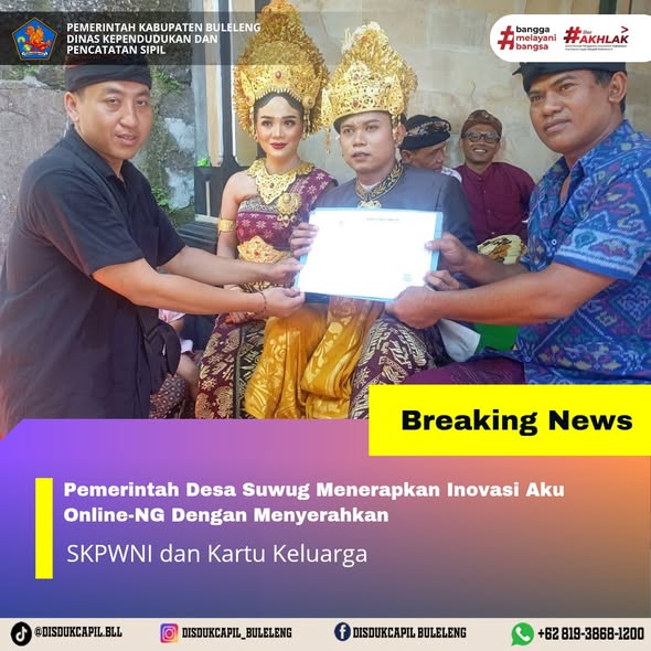 Pemerintah Kabupaten Buleleng melalui Dinas Kependudukan dan Pecatatan Sipil (Disdukcapil) Kabupaten Buleleng memaksimalkan serta mempermudah pelayanan kependudukan masyarakat dengan beberapa inovasi, melalui aplikasi AKU Online-NG. Dimana dalam penerapan aplikasi Aku Online-NG tersebut masyarakat tidak perlu lagi datang ke Dinas Dukcapil untuk melakukan pelayanan langsung cukup dengan datang ke Desa nanti akan dibantu oleh operator Desa masing-masing. Di Desa Suwug Kecamatan Sawan, Kelian Banjar Dinas Kelodan Desa suwug telah menyerahkan dokumen kependudukan berupa SKPWNI dan Kartu Keluarga di Desa Suwug Kecamatahn Sawan, Senin (10/11).