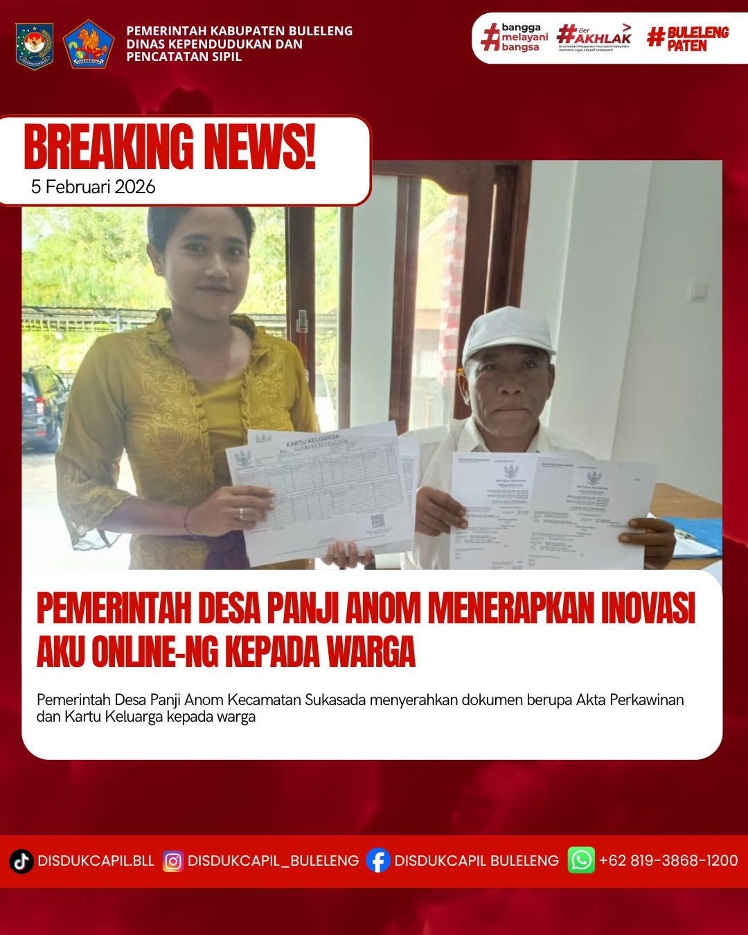 Pemerintah Kabupaten Buleleng melalui Dinas Kependudukan dan Pecatatan Sipil (Disdukcapil) Kabupaten Buleleng memaksimalkan serta mempermudah pelayanan kependudukan masyarakat dengan beberapa inovasi, melalui aplikasi AKU Online-NG. Dimana dalam penerapan aplikasi Aku Online-NG tersebut masyarakat tidak perlu lagi datang ke Dinas Dukcapil untuk melakukan pelayanan langsung cukup dengan datang ke Desa nanti akan dibantu oleh operator Desa masing-masing. Di Desa Panji Anom Kecamatan Sukasada, telah diserahkan dokumen kependudukan berupa Akta Perkawinan dan Kartu Keluarga atas nama GEDE MAHARDIKA yang diserahkan langsung oleh Operator Desa Panji Anom bertempat di Kantor Perbekel Panji Anom, Kecamatan Sukasada, Kamis (5/2).