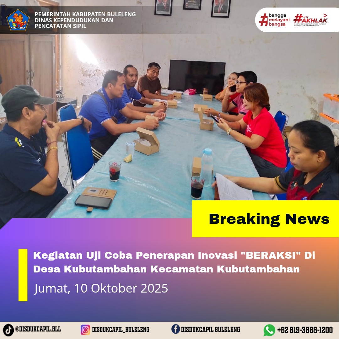 Kepala Bidang Pelayanan dan Pencatatan Sipil Disdukcapil Kabupaten Buleleng Ketut Sudarmi SE.,MAP melaksanakan kegiatan uji coba penerapan Inovasi "BERAKSI" Di Desa Bondalem Kecamatan Tejakula. Inovasi "BERAKSI" (Bertemu Warga Untuk Konsultasi dan Memberi Solusi) merupakan Inovasi baru di Disdukcapil Buleleng sebagai upaya membantu masyarakat dalam memberikan solusi dalam mengatasi permasalahan administrasi kependudukan dengan datang ke Desa dan langsung bertemu dengan masyarakat.
