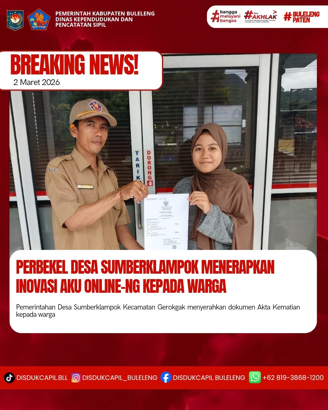 Pemerintah Kabupaten Buleleng melalui Dinas Kependudukan dan Pecatatan Sipil (Disdukcapil) Kabupaten Buleleng memaksimalkan serta mempermudah pelayanan kependudukan masyarakat dengan beberapa inovasi, melalui aplikasi AKU Online-NG. Dimana dalam penerapan aplikasi Aku Online-NG tersebut masyarakat tidak perlu lagi datang ke Dinas Dukcapil untuk melakukan pelayanan langsung cukup dengan datang ke Desa nanti akan dibantu oleh operator Desa masing-masing. Di Desa Sumberklampok Kecamatan Gerokgak, telah diserahkan dokumen kependudukan berupa Akta Kematian atas nama Musahri yang diserahkan secara langsung oleh Perbekel Desa Sumberklampok I Wayan Sawitrayasa bertempat di Kantor Perbekel Desa Sumberklampok, Kecamatan Gerokgak, Senin (2/3).