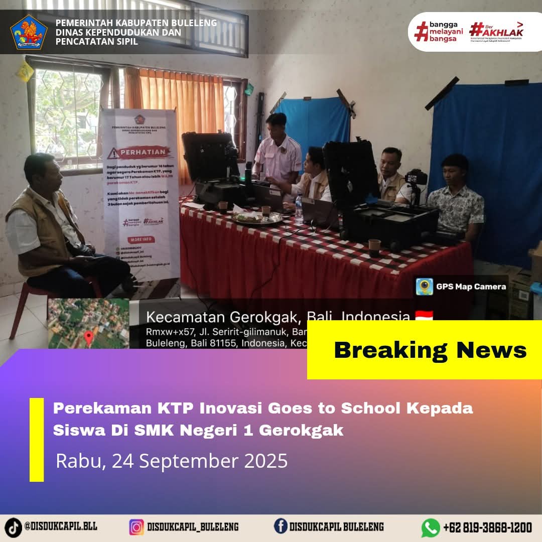 Pada kali ini Rabu, 24 September 2025 pelayanan perekaman KTP-el dilaksanakan di SMK Negeri 1 Gerokgak. Hasil perekaman di SMK Negeri 1 Gerokgak dengan data BNBA sebanyak 48 orang dan total yang melakukan perekaman sebanyak 85 orang, dimana hasil perekaman data di dalam BNBA yang melakukan perekaman sebanyak 23 orang dan data di luar BNBA sebanyak 62 orang yang melakukan perekaman. Sisa data dalam BNBA yang belum melakukan perekaman sebanyak 25 orang, keterangan dari pihak sekolah sudah diumumkan oleh pihak sekolah tetapi tetap tidak datang perekaman.
