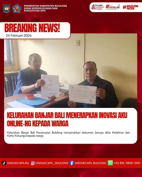 Pemerintah Kabupaten Buleleng melalui Dinas Kependudukan dan Pecatatan Sipil (Disdukcapil) Kabupaten Buleleng memaksimalkan serta mempermudah pelayanan kependudukan masyarakat dengan beberapa inovasi, melalui aplikasi AKU Online-NG. Dimana dalam penerapan aplikasi Aku Online-NG tersebut masyarakat tidak perlu lagi datang ke Dinas Dukcapil untuk melakukan pelayanan langsung cukup dengan datang ke Desa nanti akan dibantu oleh operator Desa masing-masing. Di Kelurahan Banjar Bali Kecamatan Buleleng, telah diserahkan dokumen kependudukan berupa Akta Kelahiran dan Kartu Keluarga atas nama ANDREW PRANATA WIJAYA dan RIONA LIZA TAN. yang diserahkan langsung oleh Kasi Pemerintahan Kelurahan Banjar Bali Kecamatan Buleleng, Kabupaten Buleleng, Selasa (24/2).