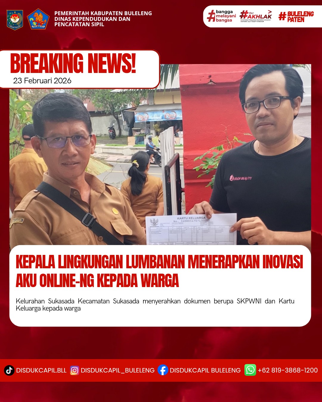 Pemerintah Kabupaten Buleleng melalui Dinas Kependudukan dan Pecatatan Sipil (Disdukcapil) Kabupaten Buleleng memaksimalkan serta mempermudah pelayanan kependudukan masyarakat dengan beberapa inovasi, melalui aplikasi AKU Online-NG. Dimana dalam penerapan aplikasi Aku Online-NG tersebut masyarakat tidak perlu lagi datang ke Dinas Dukcapil untuk melakukan pelayanan langsung cukup dengan datang ke Desa nanti akan dibantu oleh operator Desa masing-masing. Di Kelurahan Sukasada Kecamatan Sukasada, telah diserahkan dokumen kependudukan berupa SKPWNI dan Kartu Keluarga atas nama Gusti Putu Mandiyasa warga Lingkungan Lumbanan, Kelurahan Sukasada yang diserahkan langsung oleh Kepala Lingkungan Lumbanan Kelurahan Sukasada Kecamatan Sukasada, Kabupaten Buleleng, Senin (23/2).