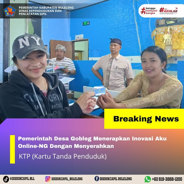 Pemerintah Kabupaten Buleleng melalui Dinas Kependudukan dan Pecatatan Sipil (Disdukcapil) Kabupaten Buleleng memaksimalkan serta mempermudah pelayanan kependudukan masyarakat dengan beberapa inovasi, melalui aplikasi AKU Online-NG. Dimana dalam penerapan aplikasi Aku Online-NG tersebut masyarakat tidak perlu lagi datang ke Dinas Dukcapil untuk melakukan pelayanan langsung cukup dengan datang ke Desa nanti akan dibantu oleh operator Desa masing-masing. Di Desa Gobleg Kecamatan Banjar, telah diserahkan dokumen kependudukan berupa e-KTP atas nama KADEK ELGA TIANA yang diserahkan langsung oleh staf administrasi Desa Gobleg bertempat di Kantor Perbekel Desa Gobleg, Kecamatan Banjar, Kabupaten Buleleng, Kamis, (16/10).