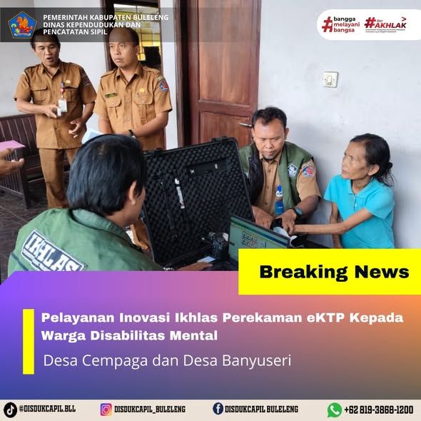 Dinas Kependudukan dan Pencatatan Sipil Kabupaten Buleleng terus berupaya memberikan pelayanan maksimal pada masyarakat dalam rangka meningkatkan kesadaran kepada masyarakat akan pentingnya memiliki dokumen kependudukan salah satunya Kartu Tanda Penduduk (KTP). Berbagai macam inovasi dikembangkan untuk mempermudah masyarakat dapat memiliki dokumen kependudukan. Salah satu Inovasi yang diberikan kepada masyarakat adalah Inovasi "IKHLAS" (Tim Khusus Layanan Untuk Orang Sakit dan Disabilitas) yaitu jembut bola perekaman KTP-el ke rumah warga yang tidak bisa datang langsung ke Kantor Disdukcapil untuk melakukan perekaman eKTP. Sesuai dengan Undang-Undang Republik Indonesia Nomor 24 Tahun 2013 tentang Administrasi Kependudukan, menyatakan bahwa Penduduk Warga Negara Indonesia dan Orang Asing yang memiliki Izin Tinggal Tetap yang telah berumur 17 (tujuh belas) tahun atau telah kawin atau pernah kawin wajib memiliki KTP-el. Namun demikian, ada beberapa penduduk yang tidak bisa datang langsung ke Kantor Dinas Kependudukan dan Pencatatan Sipil Kabupaten Buleleng karena kendala kesehatan dan usia lanjut.