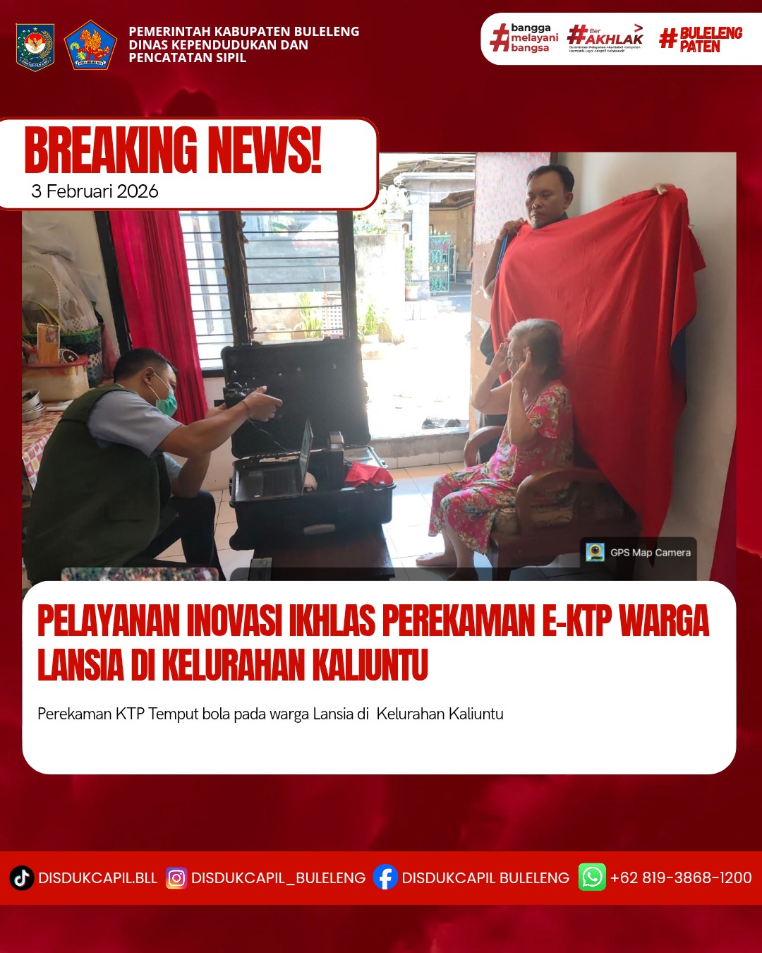 Pada hari ini Selasa, 3 Februari 2026 Dinas Kependudukan dan Pencatatan Sipil Kabupaten Buleleng melaksanakan penerapan Inovasi Ikhlas dengan melakukan jemput bola kepada masyarakat untuk melakukan perekaman KTP-El kepada warga Lansia di Kelurahan Kaliuntu atas nama :